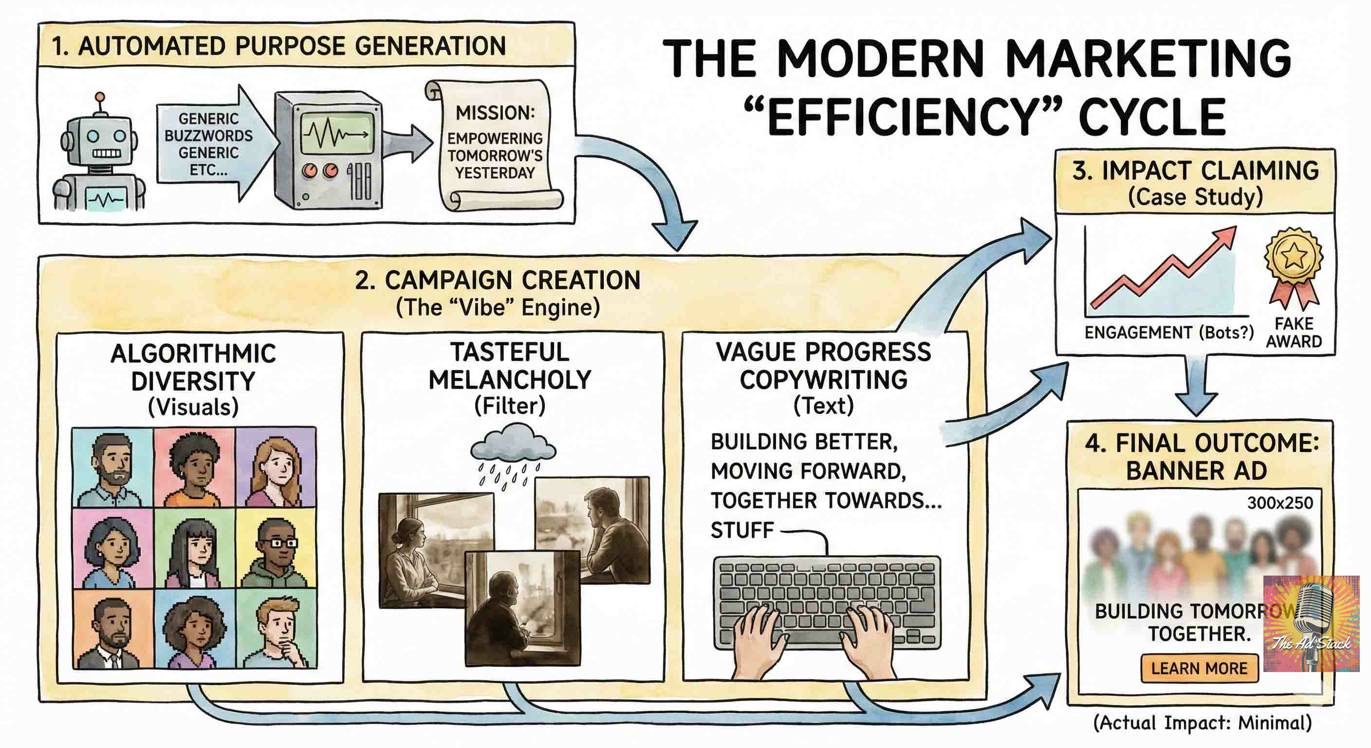 Purpose will be automated. Campaigns will feature algorithmically generated diversity, tasteful melancholy, and copy that suggests progress without naming any. The case study will claim impact.