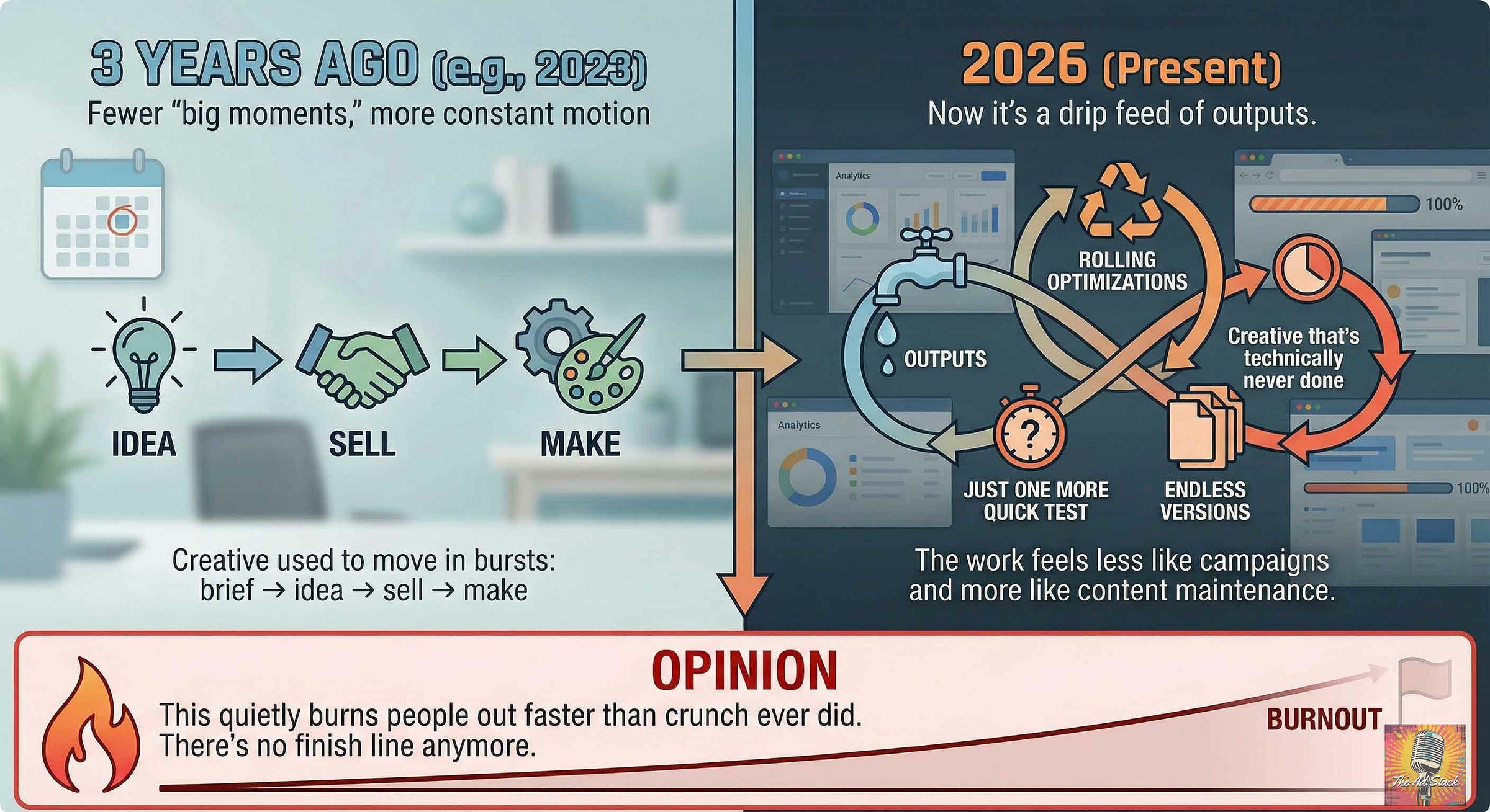 Three years ago, agency work felt like a job. A chaotic job, sure, but one with meetings you could prepare for, decks that survived more than one revision, and a vague sense that tomorrow would resemble today.