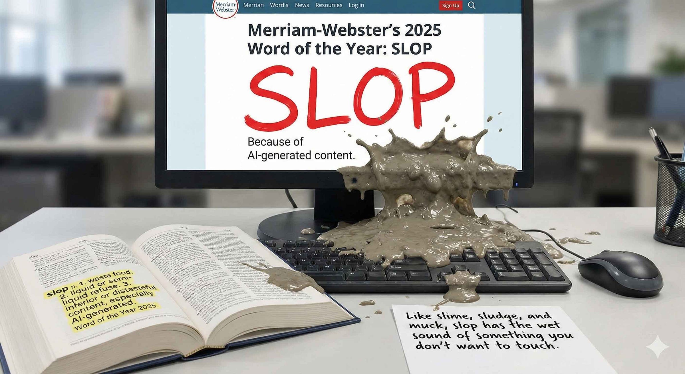 Merriam-Webster chose "slop" as 2025's word of the year specifically because of AI-generated content. "Like slime, sludge, and muck, slop has the wet sound of something you don't want to touch," CNN wrote the editors. One artist created "Slop Evader," a browser extension filtering web searches to only show results from before November 2022—before ChatGPT's release.